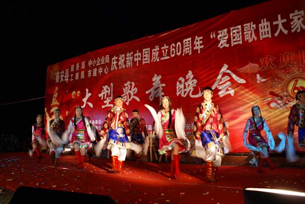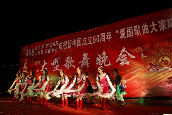 秦安县庆祝新中国成立60周年“爱国歌曲大家唱”大型歌舞晚会,于9月12日晚在秦安县兴国广场举行。晚会由秦安县商务局主办,秦安县工商局、秦安县中小局、秦安县市建中心共同协办。
