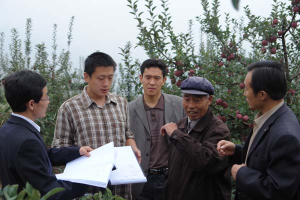 19日上午8时,在公司总经理王小宏、陇南公司副经理马荣武、质检科科长陈发平和礼县园艺站站长文平等的陪同下,有机认证检查员刘铖对礼县永坪乡苏河村的有机苹果种植转换基地进行检查。