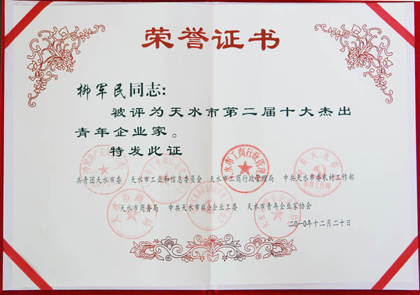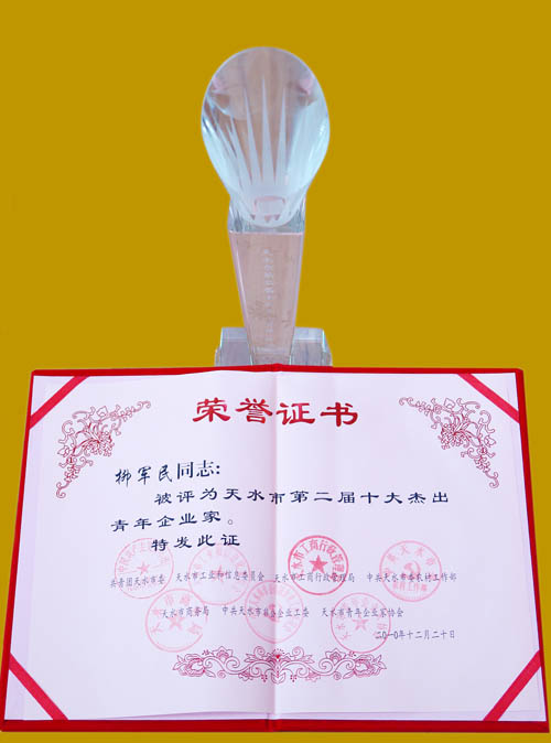 公司董事长、市青年企业家协会副会长柳军民被评为天水市第二届“十大杰出青年企业家”并受到表彰。