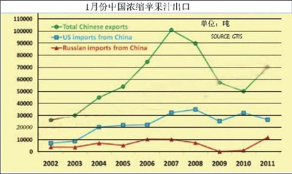 据最新发布的数据来看,2011年1月份,中国浓缩苹果汁出口凸显出了强劲的势头。这些数据不仅确凿的表明了美国的购买趋势,也反映出了俄罗斯市场的旺盛需求。 然而就像整个果汁市场一样,目前浓缩苹果汁在欧洲似乎相对平静。但是不止一个消息确认:中国浓缩苹果汁库存正在消化殆尽的事实促使很多潜在买家开始积极采取行动。 2011年1月,中国浓缩苹果汁出口量约为7.04万吨,为近四年来最高并且扭转了之前的出口颓势。2007年1月中国浓缩苹果汁出口量为10.1万吨,但自此之后便一蹶不振,甚至2010年1月都未能突破5万吨。 但俄罗斯市场的崛起却是显著的。今年1月份,中国出口俄罗斯市场的浓缩苹果汁几乎达到1.2万吨,创历史同期新高,相比于2009年1月的220吨更是有极大反差。 目前最大的问题是到底中国浓缩苹果汁还有多少库存?有些加工商认为库存已消化完。当三级果的价格还维持在大约300美元/吨,也就意味着每吨浓缩苹果汁的原料果成本将达2150美元/吨左右的时候,工厂重新开机的可能非常小。FOODNEWS预计中国浓缩苹果汁库存量不及15万吨,这其中可能有很大一部分已签合同,中国本土需求可能达4.5万吨左右。 按目前的出口率来看,中国会在4月底之前完全消化浓缩苹果汁库存。如果中国在那之后仍持续出口,那要么将会有更多的库存压到下个榨季,要么本榨季的产量高于之前所公布的,或者两方面情况兼有。据最新发布的数据来看,2011年1月份,中国浓缩苹果汁出口凸显出了强劲的势头。这些数据不仅确凿的表明了美国的购买趋势,也反映出了俄罗斯市场的旺盛需求。 然而就像整个果汁市场一样,目前浓缩苹果汁在欧洲似乎相对平静。但是不止一个消息确认:中国浓缩苹果汁库存正在消化殆尽的事实促使很多潜在买家开始积极采取行动。 2011年1月,中国浓缩苹果汁出口量约为7.04万吨,为近四年来最高并且扭转了之前的出口颓势。2007年1月中国浓缩苹果汁出口量为10.1万吨,但自此之后便一蹶不振,甚至2010年1月都未能突破5万吨。 但俄罗斯市场的崛起却是显著的。今年1月份,中国出口俄罗斯市场的浓缩苹果汁几乎达到1.2万吨,创历史同期新高,相比于2009年1月的220吨更是有极大反差。 目前最大的问题是到底中国浓缩苹果汁还有多少库存?有些加工商认为库存已消化完。当三级果的价格还维持在大约300美元/吨,也就意味着每吨浓缩苹果汁的原料果成本将达2150美元/吨左右的时候,工厂重新开机的可能非常小。FOODNEWS预计中国浓缩苹果汁库存量不及15万吨,这其中可能有很大一部分已签合同,中国本土需求可能达4.5万吨左右。 按目前的出口率来看,中国会在4月底之前完全消化浓缩苹果汁库存。如果中国在那之后仍持续出口,那要么将会有更多的库存压到下个榨季,要么本榨季的产量高于之前所公布的,或者两方面情况兼有。