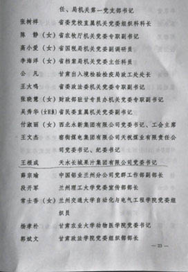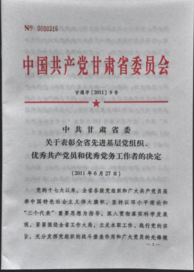 6月30日上午,甘肃省庆祝中国共产党成立90周年大会在甘肃大剧院隆重举行。大会回顾了中国共产党成立90周年以来的光辉历程和丰功伟绩,总结了在党的领导下,甘肃各级党组织和各族人民在革命和建设中作出的重要贡献,特别是改革开放以来,甘肃经济社会及各项事业取得的巨大成就。会议同时表彰了100个全省先进基层党组织、100名全省优秀共产党员、100名全省优秀党务工作者。