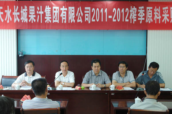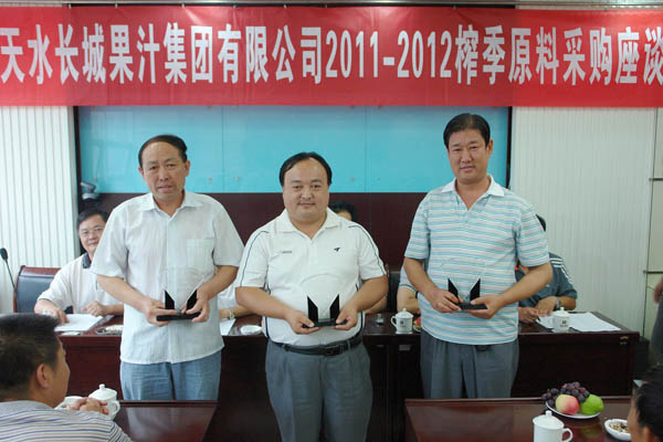7月29日,公司2011/2012榨季果农代表座谈会在天水市欣大酒店隆重召开。会议本着“和谐共赢”的合作宗旨,总结表彰了上榨季完成收购任务的果农代表,对2011/2012榨季原料收购工作进行了再动员。公司党委书记王根成、总经理王小宏、副总经理兼财务总监秦小强、总经理助理冯瑜稳,各子公司经理、原料采购员、果农代表共60余人齐聚一堂,共谋发展。会议由公司采供部部长宋健主持。