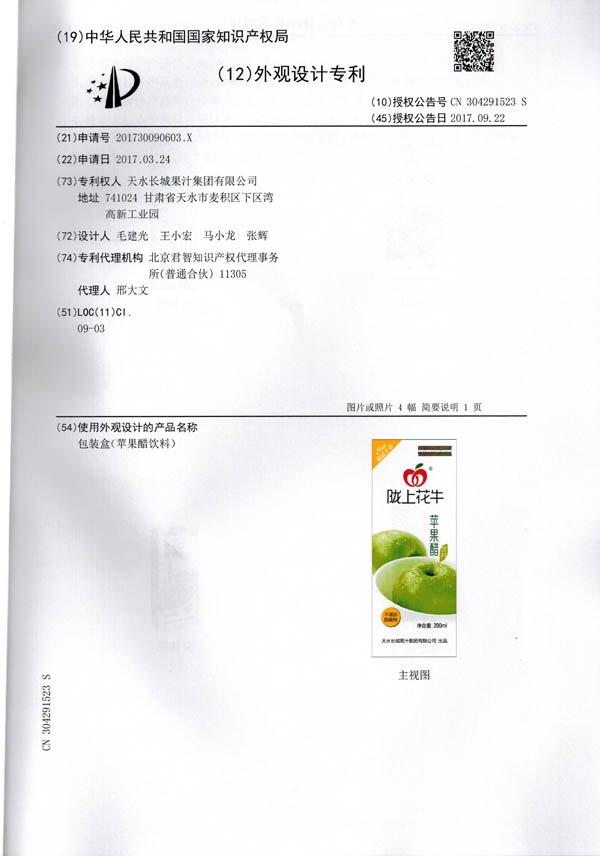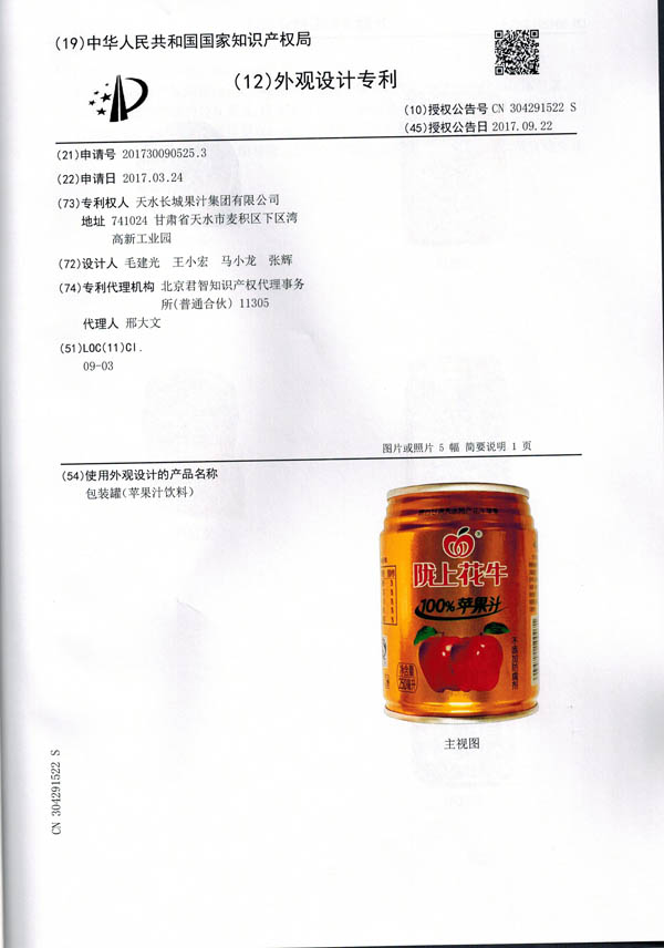 近日,公司取得由国家知识产权局颁发的两项《外观设计专利证书》,其专利名称分别为100%果汁包装罐(苹果汁饮料)和“包装盒(苹果醋饮料)”。外观设计专利的取得有利于公司进一步加强在相关应用领域的市场竞争力,对公司未来发展将产生积极的作用。 |