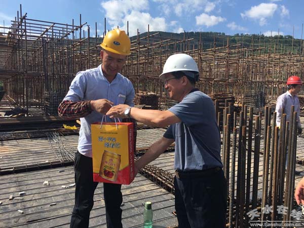 8月9日,天水市人大常委会副主任、市总工会主席蒲朝晖率领市总工会人员开展“夏送清凉”慰问活动。为在高温下坚守一线岗位的劳动者送去了我公司“陇上花牛”100%苹果汁和亲切的问候。 |