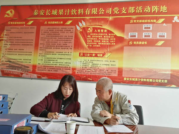 党委副书记王仕郁与党办组织干事对各党支部标准化建设进行专项督查。通过翻阅资料、实地查看、个别访谈等方式,围绕党支部日常工作开展、发展党员、“三会一课”、“主题党日”等制度执行、党支部对标达标等26项工作开展情况进行了全面督查。 纪委办公室、监事会办公室负责人对秦安公司、陇南公司苹果原料收购流程进行了检查。