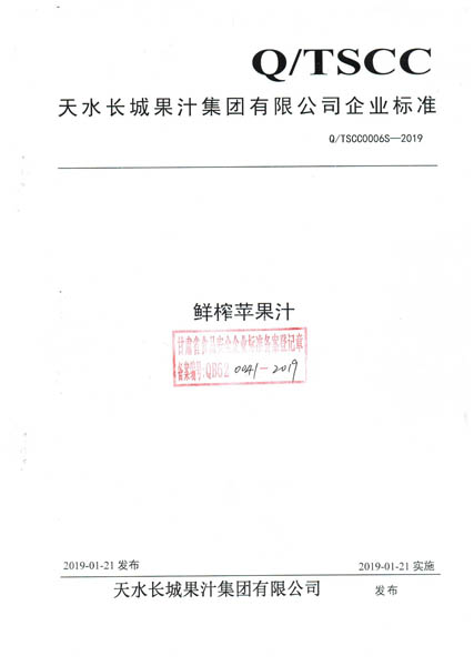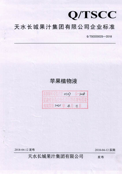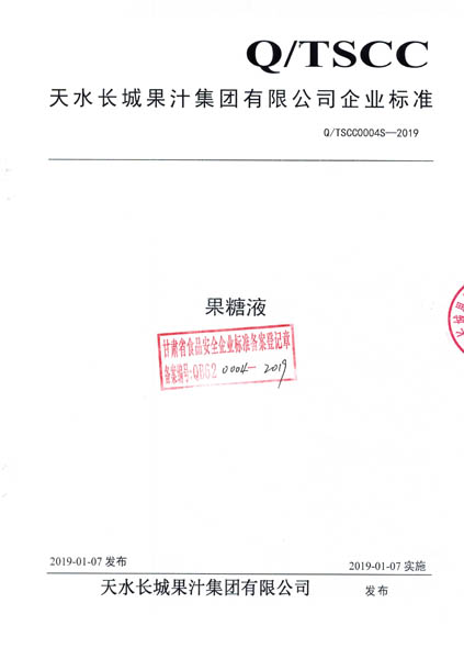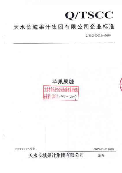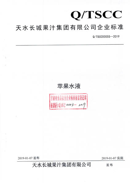 2018年4月完成企业标准《苹果植物液》(编号:Q/TSCC0002S-2018)的起草备案、2019年1月完成《苹果果糖》(编号:Q/TSCC0003S-2019)、《果糖液》(编号:Q/TSCC0004S-2019)、《苹果水液》(编号:Q/TSCC0005S-2019)、《鲜榨果汁》(编号:Q/TSCC0006S-2019)五份企业标准的起草备案。