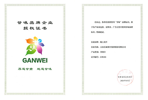 近日,我公司被麦积区农业农村局授予“甘味”品牌企业,“陇上花牛”被认定为“甘味”品牌。