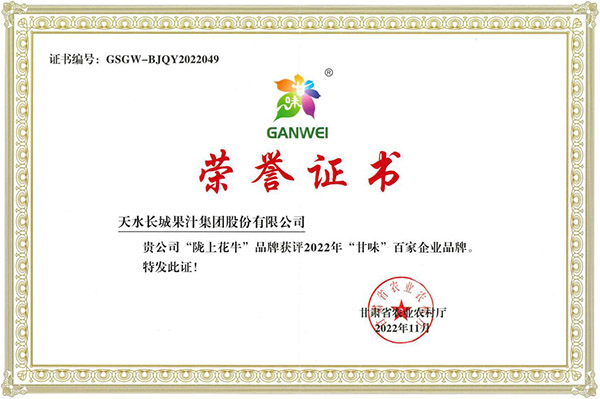 近日,公司被甘肃省农业农村厅评为“甘味”百家企业品牌,这是继2021年麦积区农业农村局授予公司“甘味”品牌企业后的又一殊荣。 |