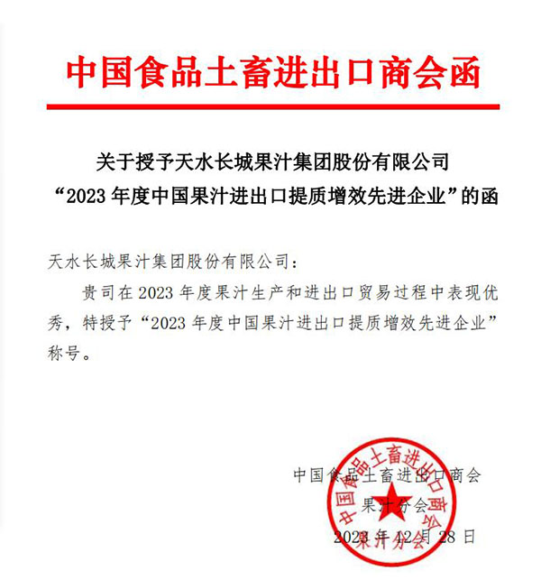 近日,公司被中国食品土畜进出口商会果汁分会授予“2023年度中国果汁进出口提质增效先进企业”称号。 |