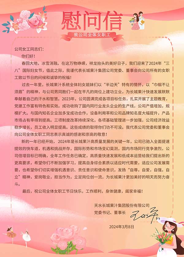 | 党委书记、董事长致公司全体女职工“三八”妇女节的慰问信 |