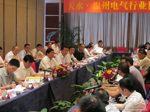 (长城电工总工程师、天水电器工业联合会执行副会长张建成代表天水电器联合会 天水市市委常委、政法委书记赵卫东,副市长雷鸣,全国民营企业500强中国人民电器集团董事长、温州电器行业协会会长郑元豹及温州部分知名电工电器企业负责人、电器行业协会相关领导出席了相关会议,并分别就进一步加强两地电器行业协会的交流合作,推动两地电工电器企业优势互补、共同发展等进行了深入的座谈交流。
