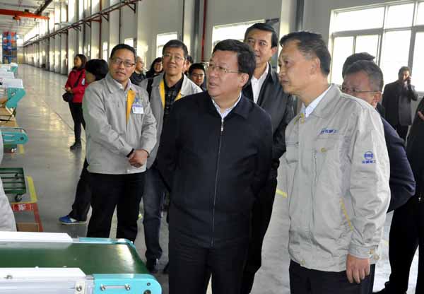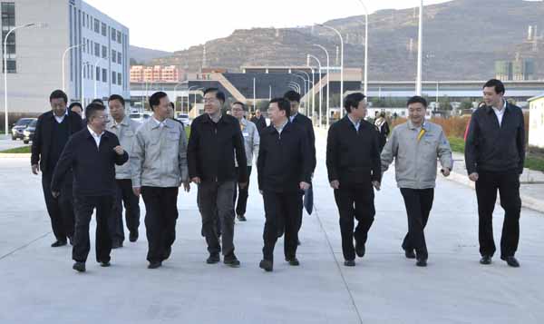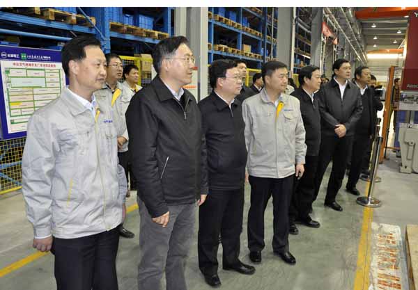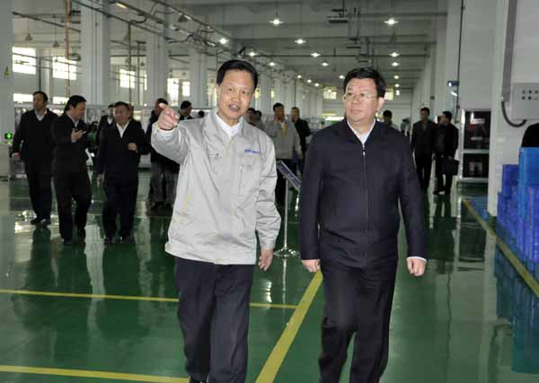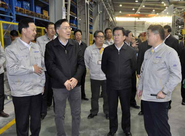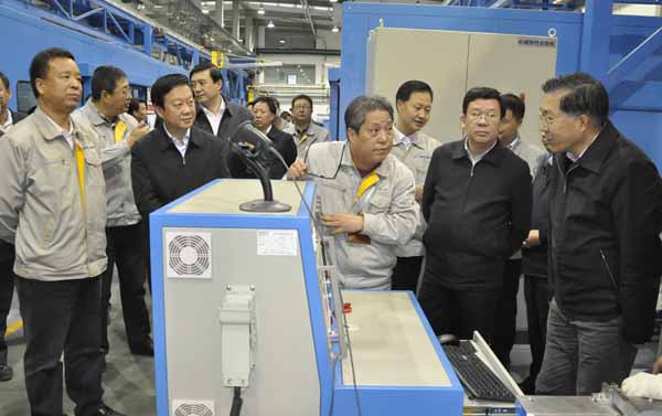 陈钢(左二)、夏红民(右二)听取公司董事长杨林(左一)、总经理张希泰(右一) 工作汇报 10月26日下午,以国家质检总局党组成员、副局长陈钢为组长的国务院质量工作考核组一行,在甘肃省政府副省长夏红民的陪同下来长城电工检查指导工作。