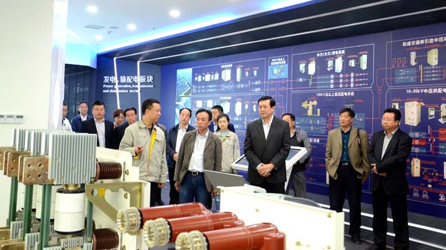 赵卫东一行深入长城电工长开厂公司B1中压空气绝缘开关设备制造数字化车间生产现场进行调研后,参观了长城电工天水电工电器产业园展厅。张建成就长城电工园区建设、生产经营等方面的工作进行了汇报与介绍。