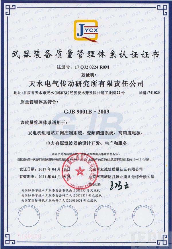 近日,长城电工天水电气传动研究所有限责任公司取得了北京军友诚信质量认证有限公司颁发的武器装备质量管理体系认证证书。该证书适用范围是公司发电机组电站并网控制系统、变频调速系统、高精度电源、电力有源滤波器的设计开发、生产和服务。