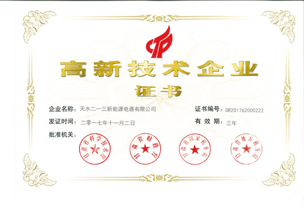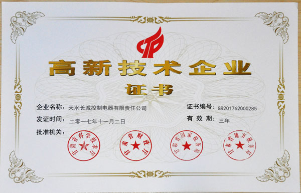 2017年11月, 长城电工天水长城控制电器有限责任公司、天水二一三新能源电器有限公司被国家科技部认定为 “高新技术企业”,省科学技术厅、省财政厅、省国家税务局、省地方税务局联合颁发了证书。
